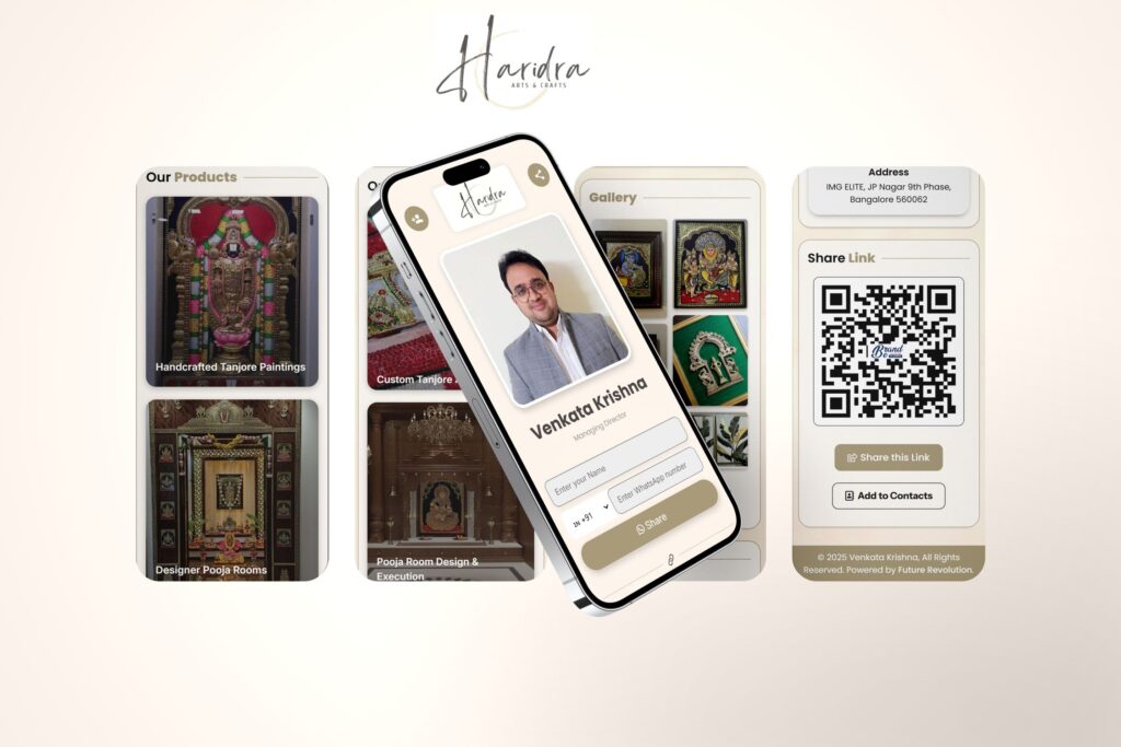 Artist and entrepreneur specializing in authentic Tanjore paintings, contemporary artworks, customized canvas creations, and designer pooja rooms.